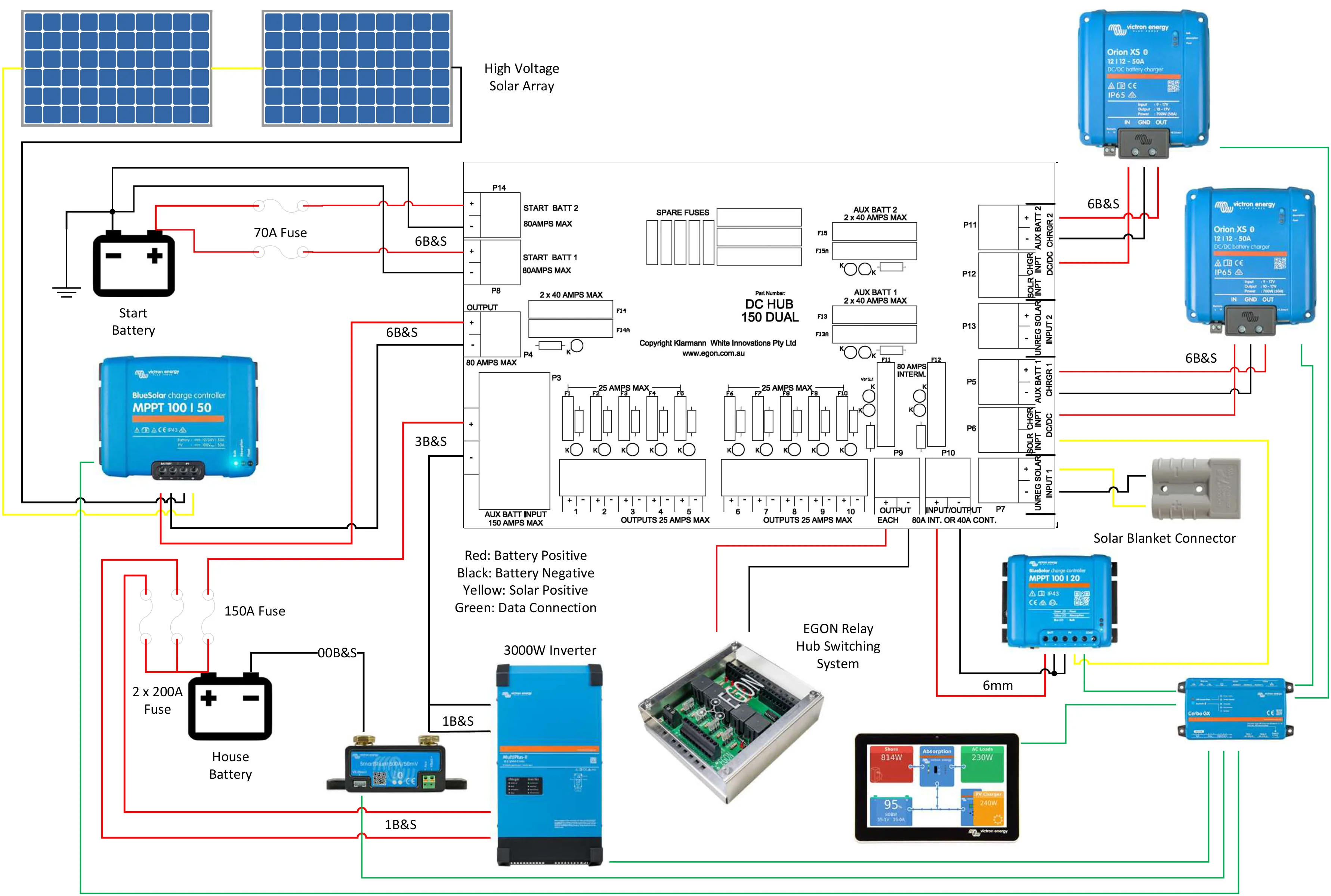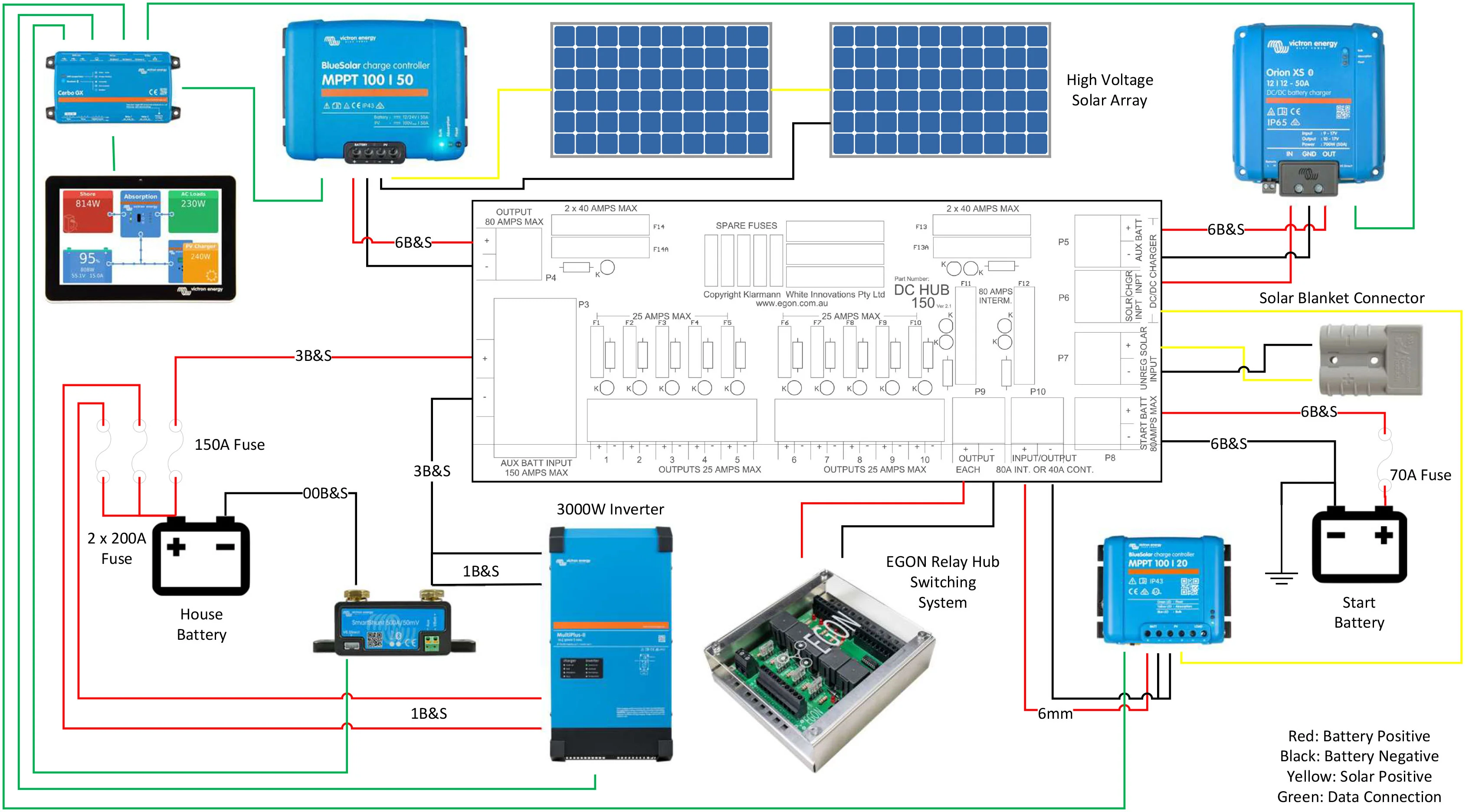 This example shows a more complex DC system. It includes: a 50A DC/DC charger, 50A roof solar controller, 20A solar blanket charge controller, 3KVA Multi Plus inverter/charger, shunt, Cerbo GX, and a Touch-50 screen, all working alongside an EGON Relay-Hub switching system.