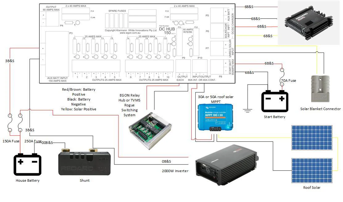 Curious how the Redarc Manager Alpha-100 fits into the EGON architecture? Easily. Add a shunt, TVMS display, 2KVA inverter, TVMS Rogue switching system, roof solar, and solar blanket connections, and you’re good to go. Perfect for caravans, camper trailers, canopies, large wagon setups, and RVs.