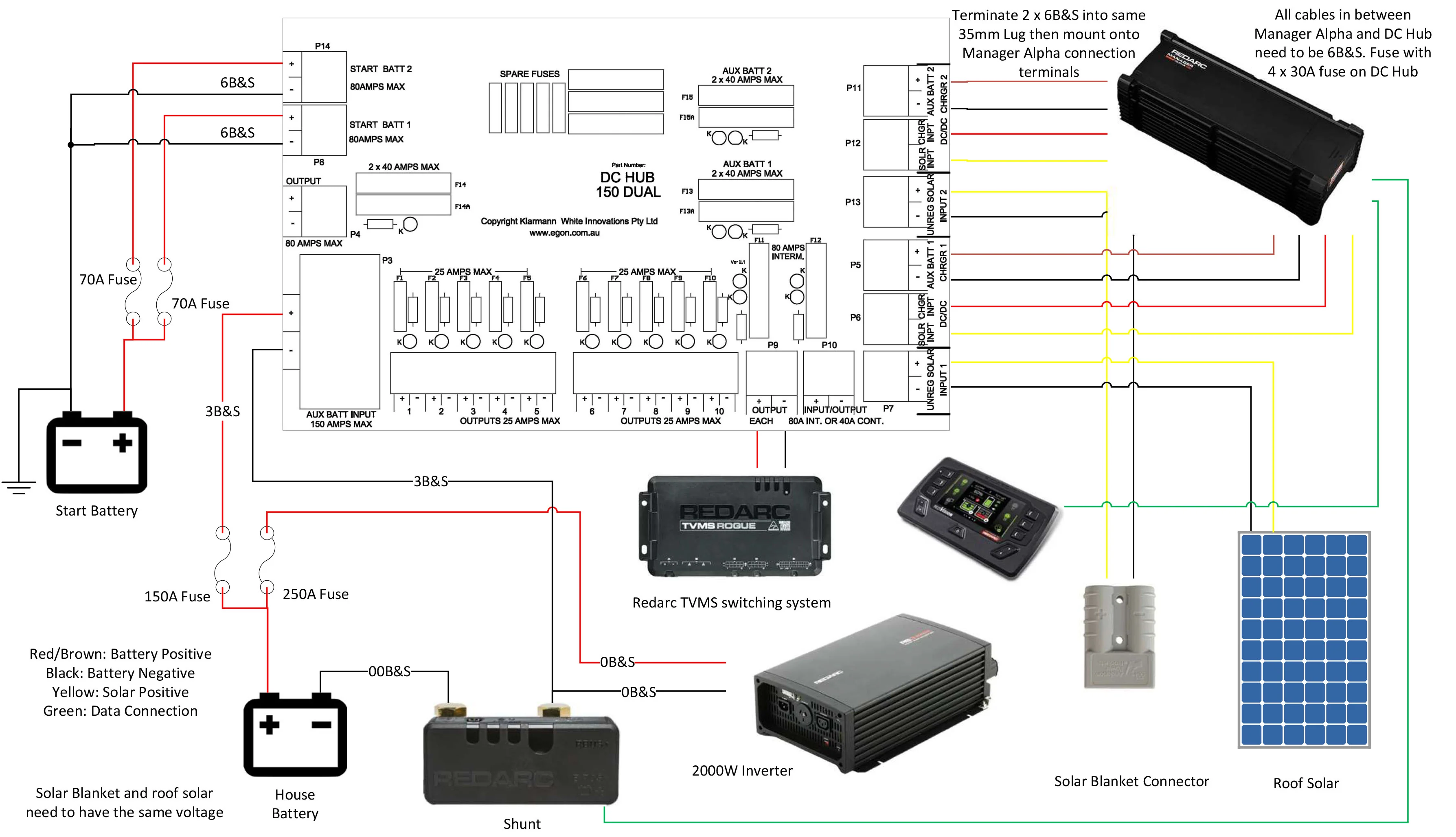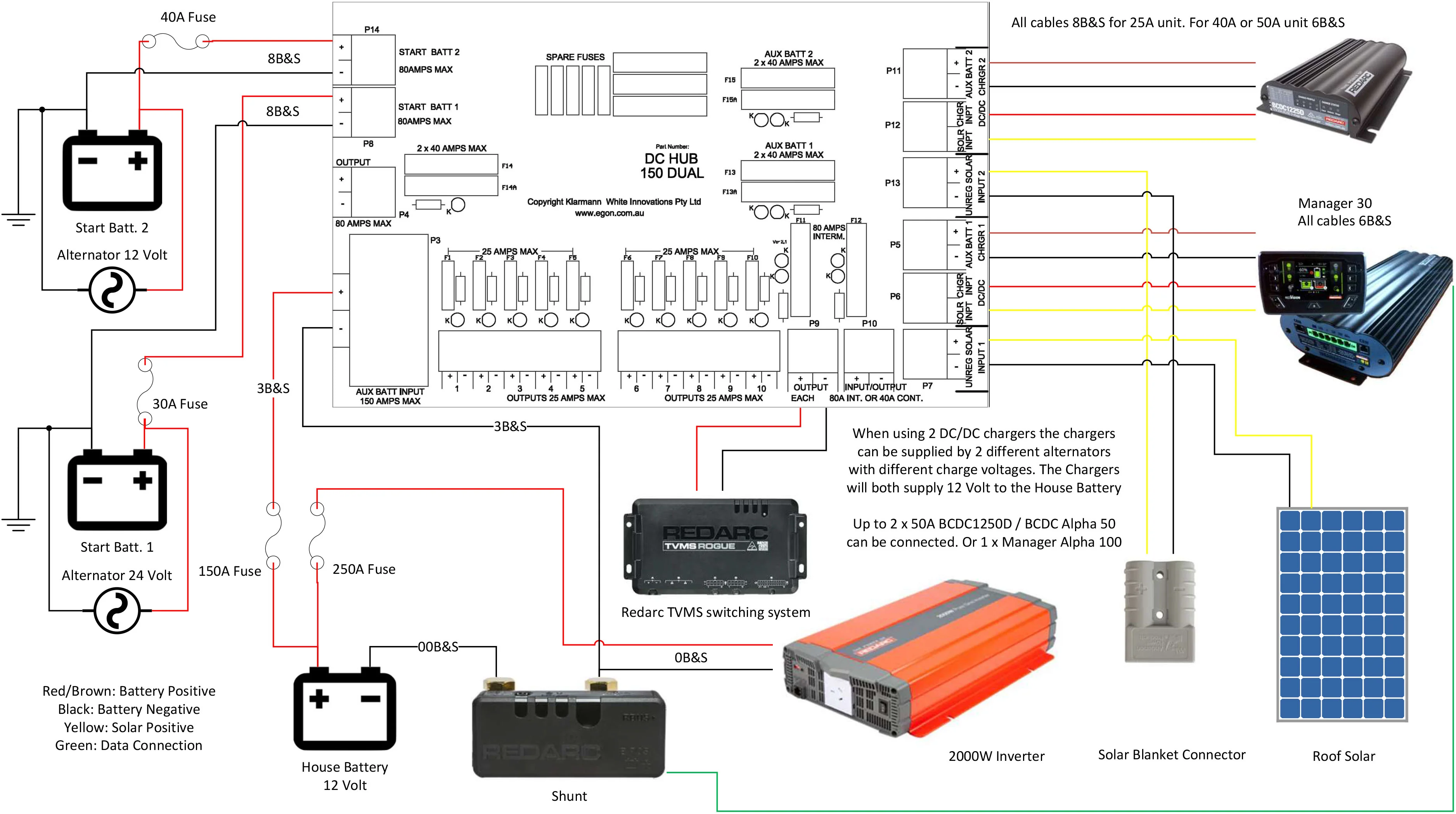 Running a more intricate setup? DC-Hub Dual permits a configuration that combines two different start batteries with two alternators, even if they are producing different charge voltages. Add in a Redarc DC/DC charger, the Redarc Manager 30 with shunt, a Redarc TVMS Rogue switching system, a 2KVA inverter, a solar blanket connector, and a roof solar panel, and you’re officially operating at expert level. But the DC-Hub DUAL makes this so simple!