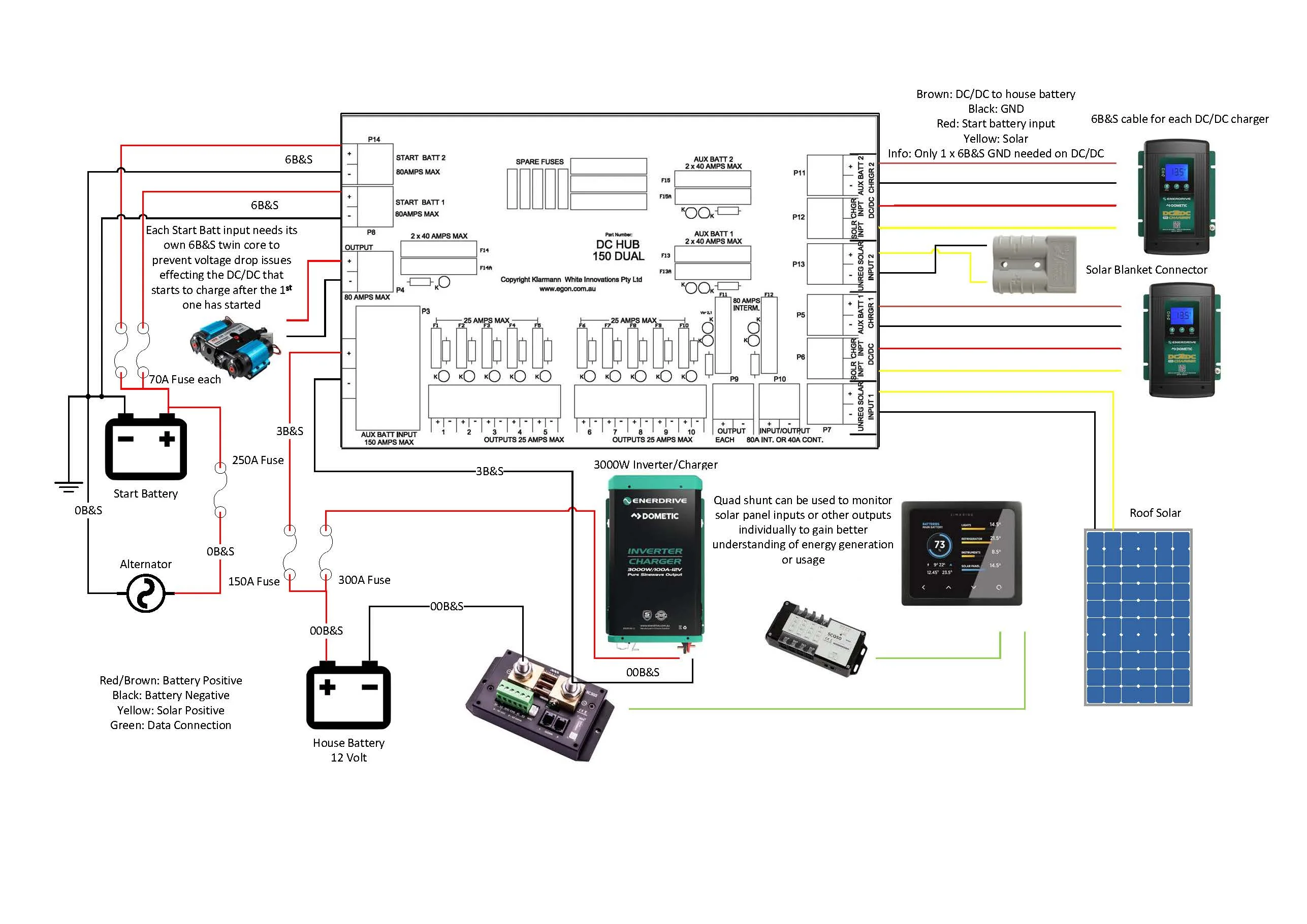 This wiring configuration works in boats with two alternators and different charge voltages but can easily adapt to a single start battery/alternator for canopies, Troopcarriers, wagons, caravans and camper trailers.